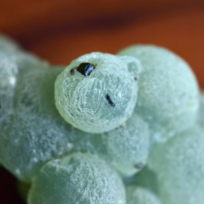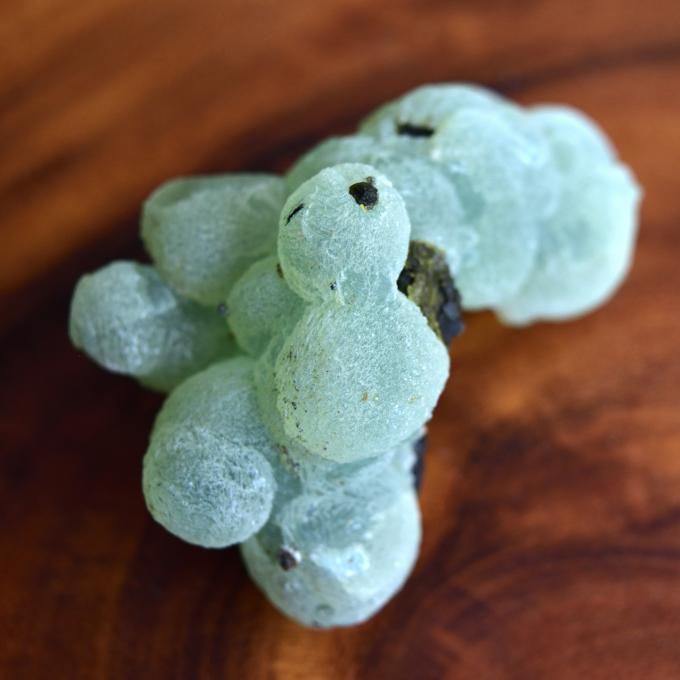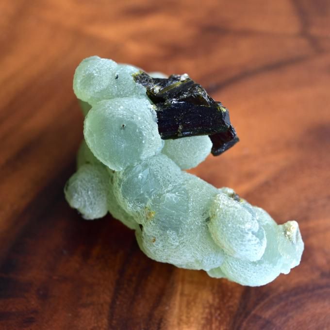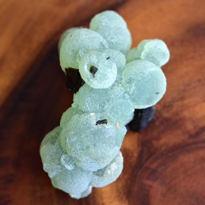ブラックトルマリンやエビドートと共に産出されるプレナイト。粒粒したブドウ状の塊で発掘されることから和名はブドウ石、英名は発見者のオランダ人プレーン大佐の名にちなんで付けられました。