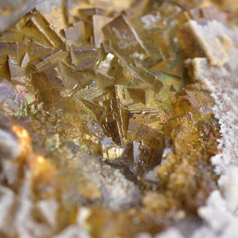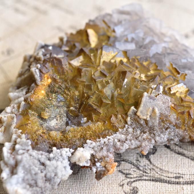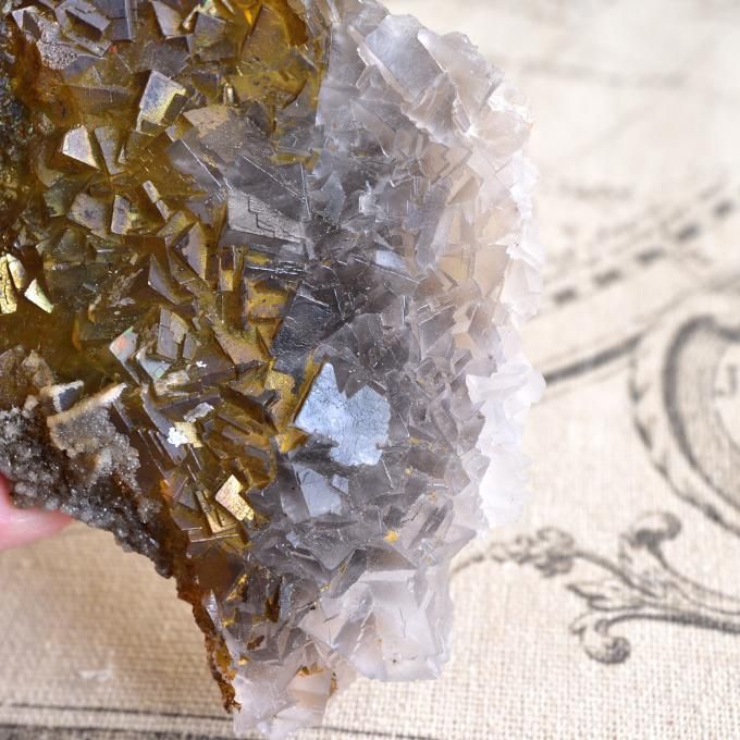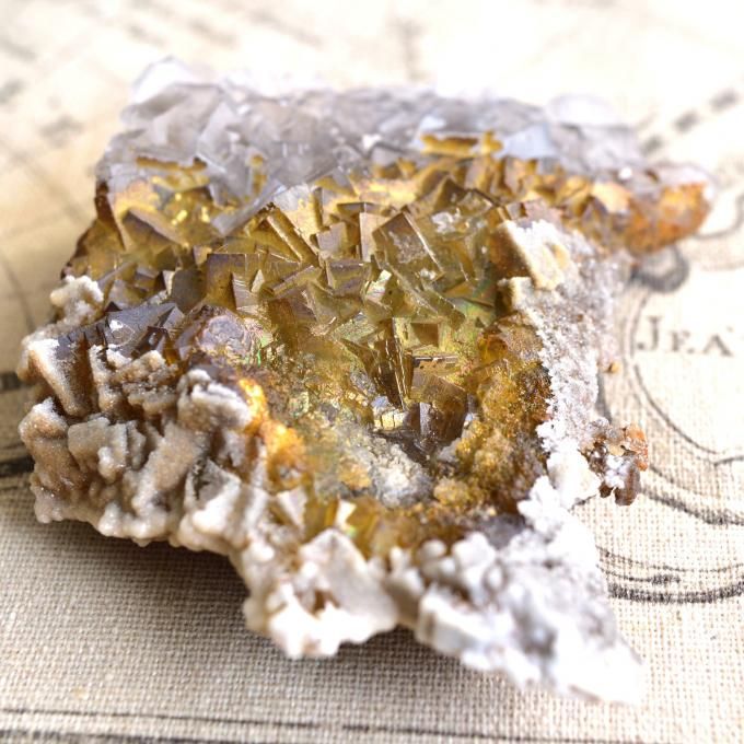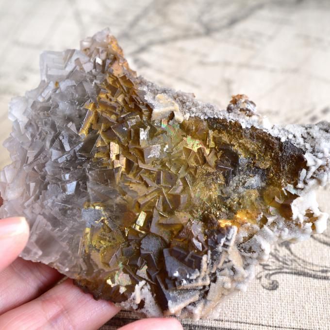 元々はグレーのフローライトが、表面に金箔のような膜に覆われ、さらにイリデッセンスが映えるようです。