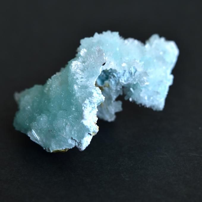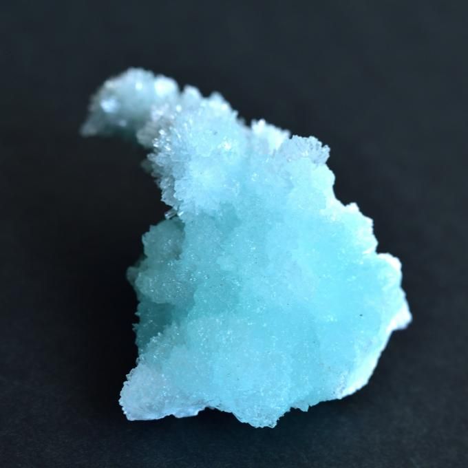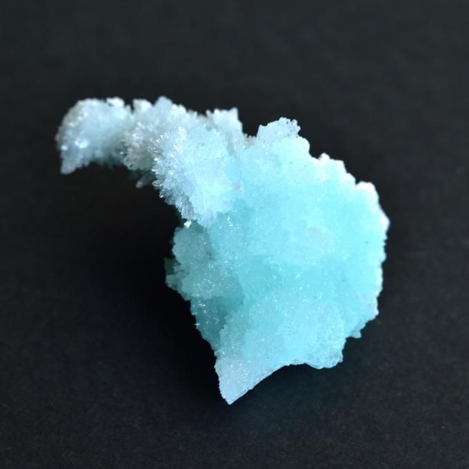 人魚が消えた海の泡のような結晶を持つブルーアラゴナイト。モコモコとした塊状の結晶ですが、針のような柱状の結晶も共生しています。貝殻の成分から生まれたブルーアラゴナイトには海の女神、海の生命力と繋がるイメージがあるように思います。